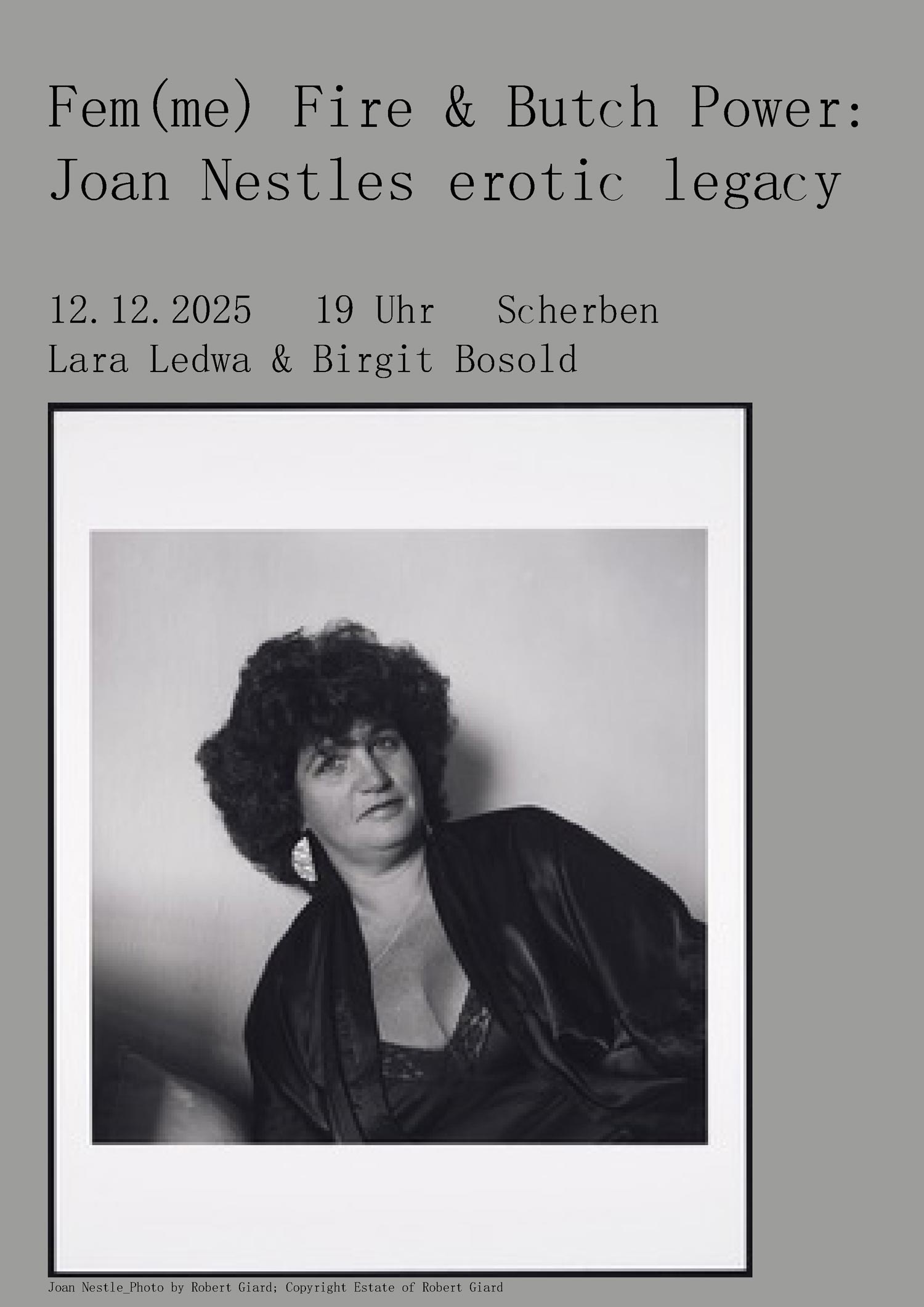 Scherben invites you to Lesbian Legacies # 3 The Butch is Here to Stay a group exhibition with artists Ella C Bernhard, Dana DeGiulio, Risk Hazekamp, Ottilie Roederstein, Toni Schmale and Anne Schmidt. The Butch is Here to Stay is the second exhibition of the three-part exhibition project Lesbian Legacies which is curated by Scherben and Birgit Bosold. The Butch is Here to Stay will open on November 14 2025, and be on view until Dezember 14. 2025.