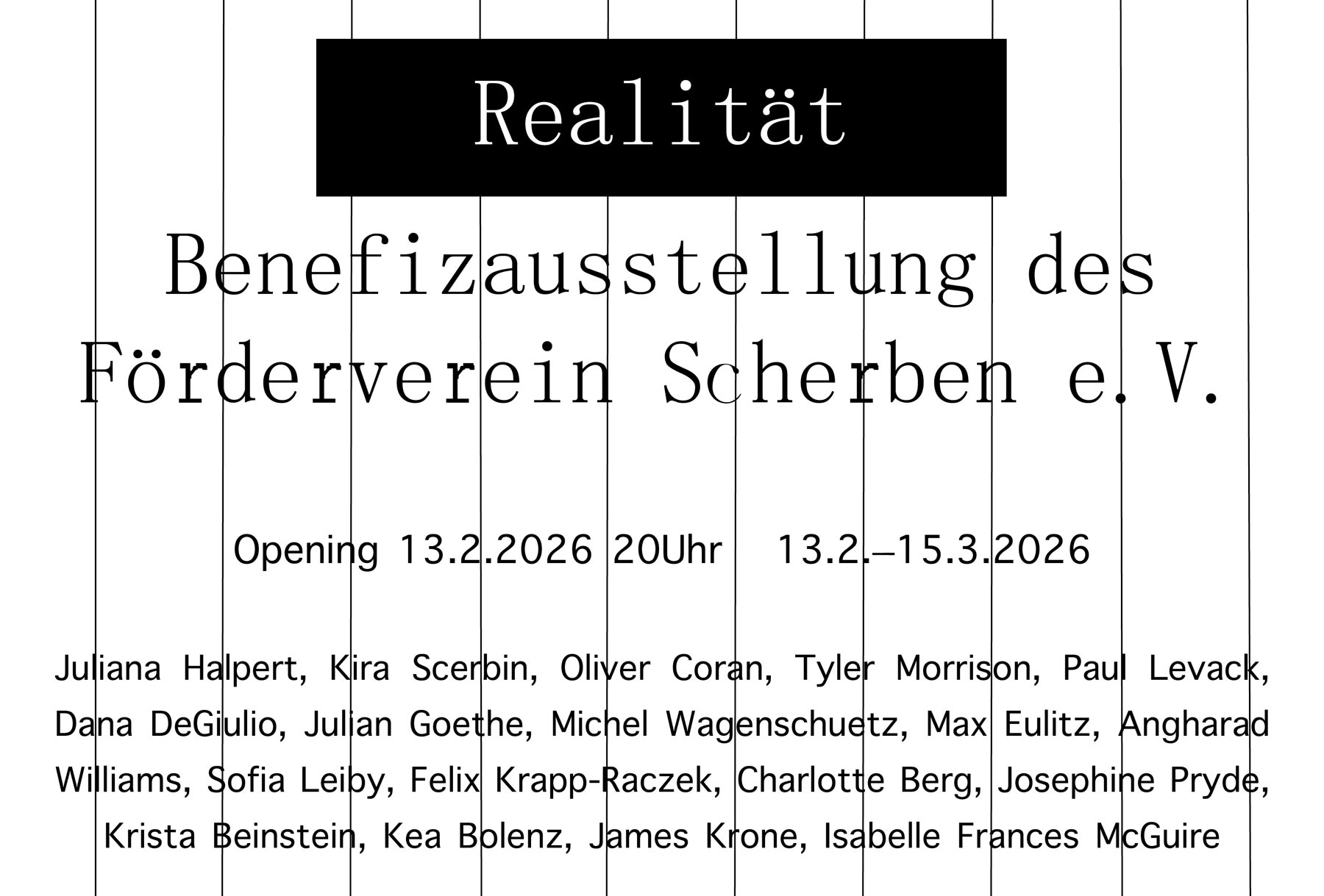 Scherben invites you to Realität, the first benefit exhibition by the Förderverein Scherben e.V. Realität presents work by Juliana Halpert, Kira Scerbin, Oliver Coran, Paul Levack, Dana DeGiulio, Max Eulitz, Michel Wagenschuetz, Angharad Williams, Felix Krapp-Raczek, Sofia Leiby, Kea Bolenz, Josephine Pryde, James Crown, Krista Beinstein, Charlotte Berg, Isabelle Frances McGuire.